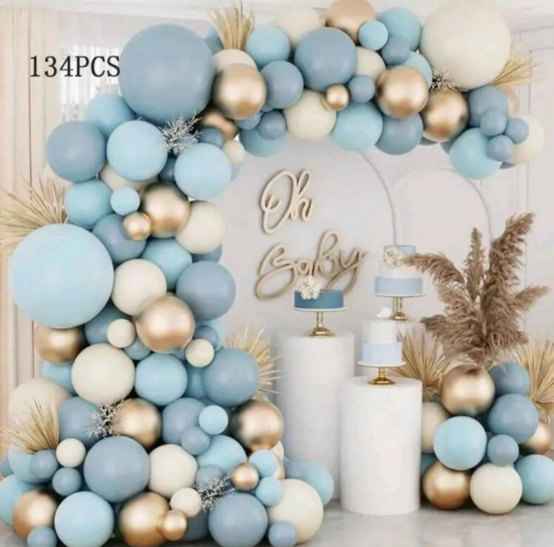 1 шт кулька латте 48 см 1 шт кулька блакитна 48 см 1 шт кулька сіра 48 см 15 шт кульки хром золото 26 см 4 шт кульки хром золото 13 см 25 шт кульки латте/сірий/блакитний 13 см 70 шт кульки латте/сірий/блакитний 26 см Пластикова стрічка для швидкого монтажу арки Клейові гель-крапки упаковка 100 шт