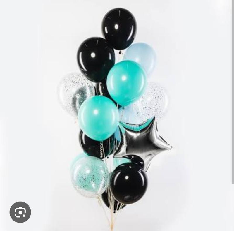 Набір повітряних кульок Зірочка У набір входить: Фольгована фігура Зірка срібло 45 см - 1 шт Куля аквамарин 25 см - 4 шт Куля чорна 25 см - 7 шт Куля блакитна 25 см - 2 шт Куля зі срібним конфеті 30 см - 3 шт