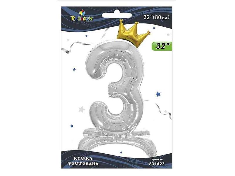 Кулька фольгована цифра 32 (80 см) з короною на підставці 3 срібло тм pelican