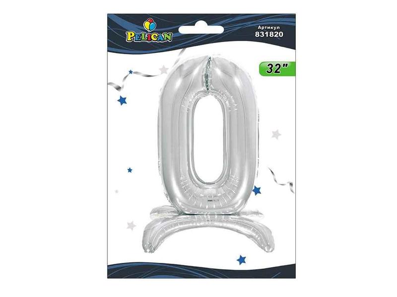 Шарик фольгированная цифра на подставке 0 срибло 80см. 831820 тм pelican