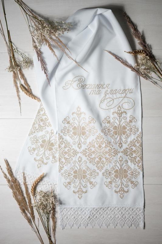 Розмір 180*31 см (+-0,5см) Український обрядовий рушник машинна вишивка хрестиком. Візерунок виконаний золотими металізованими нитками, що робить вишивку більш об'ємною.