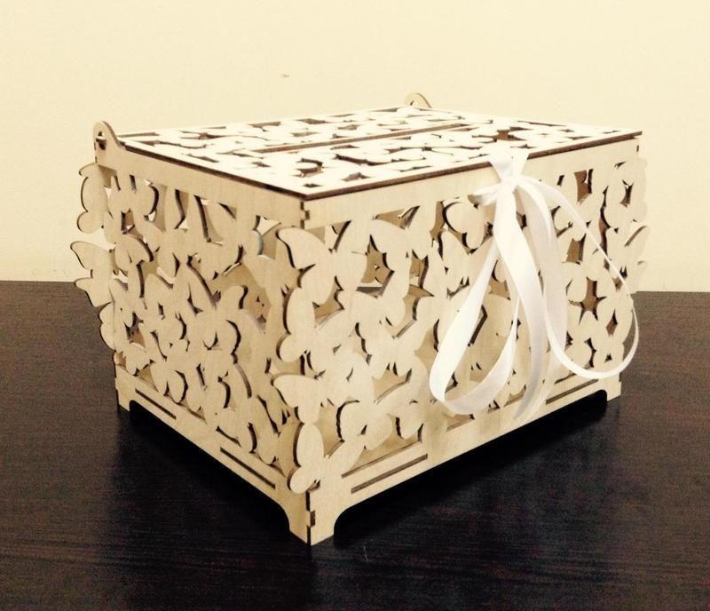 Скриня різьблена для збору грошей "Сімейний банк" виготовлена з фанери завтовшки 3 мм Розмір Верхня кришка відкривається., у ній велика проріз для конвертів. У кришці є отвір для купюр і конвертів з грошовими подарунками. Шкатулка для зберігання грошей являє собою невелику коробочку, в якій ви можете залишити купюри. Це зручно з тієї точки зору, що грошові знаки не будуть измяты, і зберігається на торжестві як у банку. Висота 17 см, ширина 28 см, глибина 20 см довжина отвору для конверта 17 см х 1,5 см