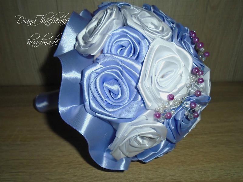 Букет изготовлен из атласной ленты. Розы 6-7 см Диаметр 25-30 см. Высота 25-30 см.