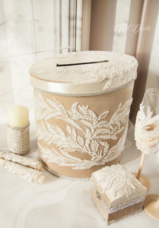 Скриня для грошових подарунків. Після весілля слугуватиме гарним декором, в якому можна зберігати інші весільні аксесуари. Прикрашена люксовим мереживом, що розшите бісером та паєтками і оксамитом. Інший колір обговорюється. Ціна вказана за розмір коробки 25/25 см. Можливе виконання за 20/30 см за додаткову плату. Товар під замовлення