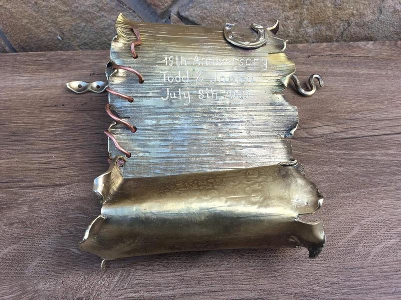 Ось чудовий ручний бронзовий сувій на бронзовій вішалці, який можна повісити на стіну. Він прикрашений підковою та мідним дротом і має можливість для гравіювання (імена, дата, текст...). Це чудовий подарунок на весілля, 8-му річницю весілля (бронзова річниця), 19-ту річницю весілля (традиційний бронзовий подарунок), для вираження кохання, заручин, Дня святого Валентина та багатьох інших святкових подій! Розміри: висота - 27 см ширина - 16 см Колір: не фарбований. Має гарний бронзовий колір первісної бронзи. Виготовлений з бронзи. Ручна робота. Дуже важкий для свого розміру! У деяких місцях він може мати зелену або темну тінь в результаті окислення бронзи (це свідчить про його чистоту). Гравірування з іменами, датою та коротким повідомленням на сувої включено в ціну. Текст на сувої буде написаний від руки або вигравюваний лазером.