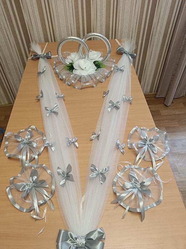 набір весільних прикрас на машину. фатинова стрічка довжиною 3 метри, 4 шт прикраси на руки, кольца на магнітах