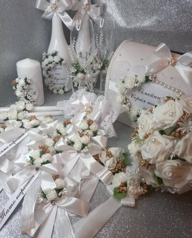 До набору входить: Шампанське 800грн/пара Келихи 600грн/пара Набір свічок "Сімейне вогнище" 650грн Букет-дублер 400грн Підвязка нареченої 150грн Скринька для конвертів 300грн Вартість вказана без бутоньєрок. Вартість бутоньєрок 25-70грн