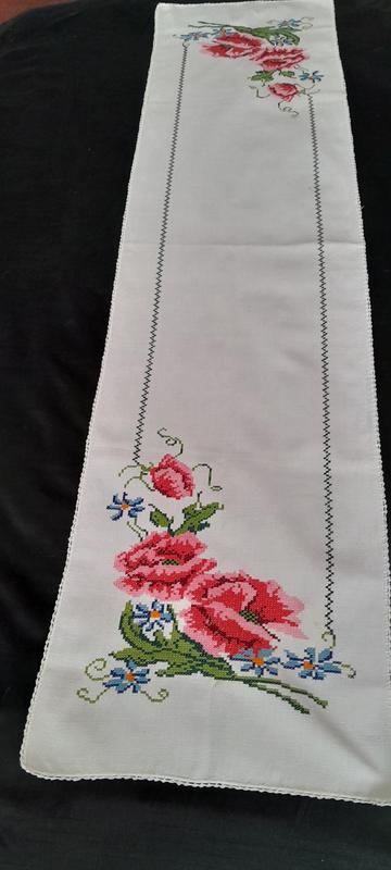 Весільний рушник, вишитий хрестиком (до ріжка на стіл)..Матеріал-бавовна. Заміри: довжина 138 см, ширина — 34 см. Нове.