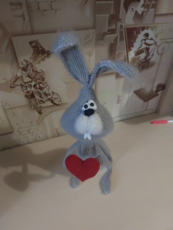 заєц звязаний гачком по МК Потаповой,наповнювач холлофайбер,зуби та очі полімерна глина,на проволочном каркасе
