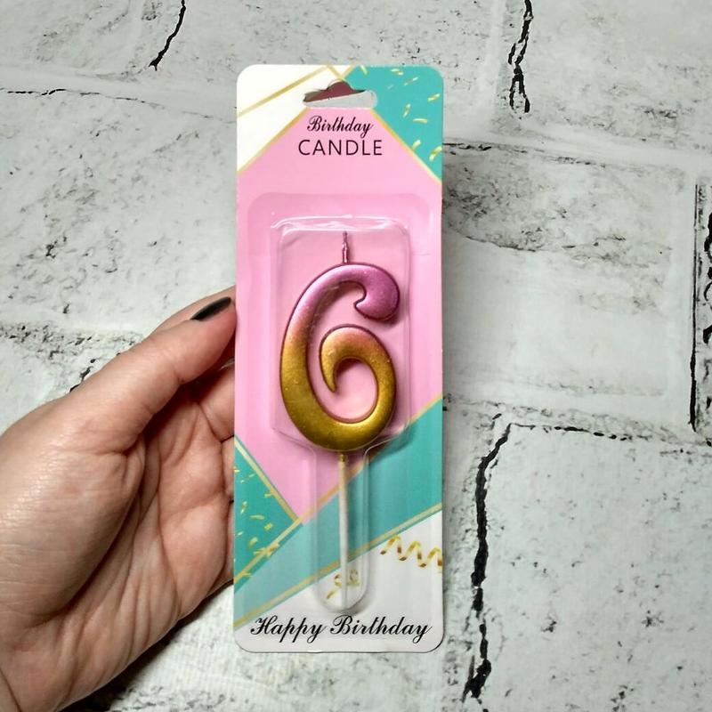 Свічка в торт цифра 6, градієнт. Характеристики: Країна виробник - Китай Розміри: Загальна висота - 9 см Розмір цифри - 5 см Свічка виготовлена з високоякісного парафіну. Не містить шкідливих для здоров'я домішок. Увага! Не залишайте без нагляду запалені свічки.