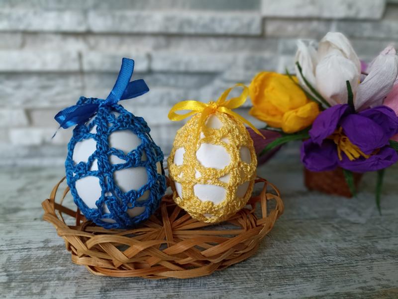 Чохли для великодніх яєць пов'язані гачком зі 100% бавовняної пряжі, зав'язуються атласними стрічками. Яйце легко вміщується та виймається з чохла. Будуть чудовим подарунком та сувеніром на Великдень. Можна повісити на гілочки і таким чином прикрасити букет або дерево. Незвичайний та оригінальний подарунок порадує рідних та близьких. Чохли можна використовувати неодноразово.