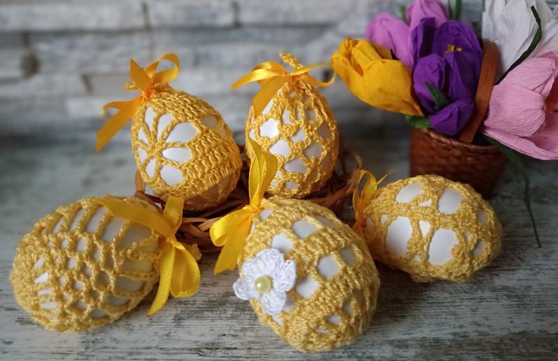 Красиві та унікальні, ажурні писанки в жовтому кольорі.яйця мають підвіски.Можна повішати на кошик до Великодня.