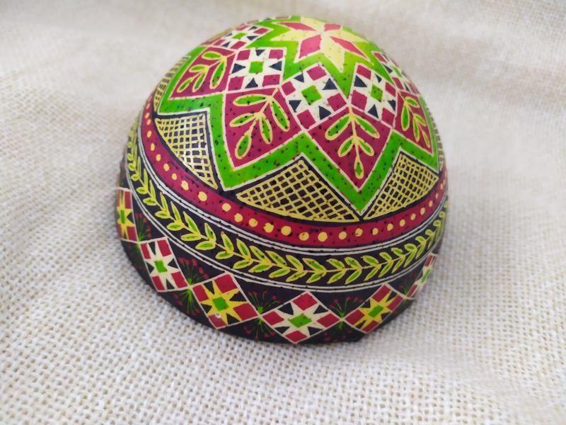 Воскова розпис на натуральній шкаралупі аніліновими барвниками, 5 отворів для кріплень ( висота 6 см і ширина 12,5 см, обхват 39 см).