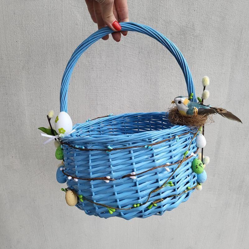 Дитячий пасхальний кошик з пташкою в гнізді та яєчками для хлопчиків. Кошик плетений з лози та пофарбований у блакитний колір. Розмір кошика (діаметр): Діаметр 16 -17 см ( 1-4 роки) - 360 грн 18-19 см(4-6 років) - 375 грн 20-22 см ( від 7-8 років) - 390 грн