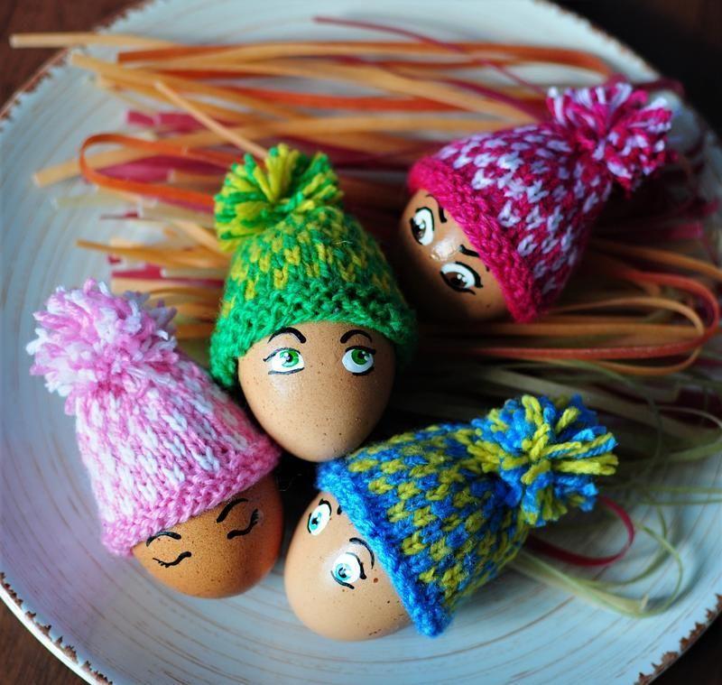 Плетені різнокольорові шапочки з бомбонами стануть цікавою прикрасою для Вашого великоднього кошика, або пасуватимуть до Великоднього інтер'єру. Ціна вказана за набір з чотирьох шапочок.