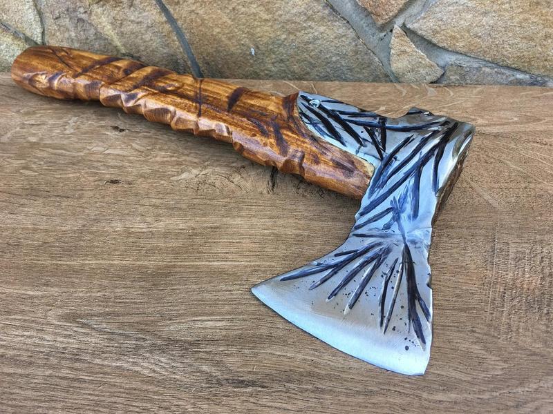 Шукаєте незвичайну сокиру, ковану вручну? Ви в потрібному місці і в потрібний час. Ось вона! Розміри: - Довжина ручки (з бука): 41 см - Довжина наконечника сокири: 17 см - Робоча довжина леза: 9 см - Вага нетто: 1 кг Колір ручки: коричневий з випаленими смугами. Сокира виглядає декоративно, але це справжня гостра сокира! Гарний подарунок на річницю весілля (6, 11), день народження, День батька та багато інших свят! Це може бути найкращим функціональним витвором мистецтва та прикрасою у вашому домі!