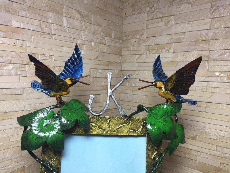Фоторамка може бути не тільки звичайною фоторамкою, але й шедевром, який може прикрасити ваш дім та зафіксувати найкращі події в житті. Ось гарна кована фоторамка ручної роботи, яка складається з гарної гілки плюща із зеленим листям, двома птахами на вершині (королівські рибальські птахи) та ініціалами молодої пари J & K (ініціали можна змінити на інші або видалити на ваш запит). На останньому фото ви бачите птаха короля рибалки, з якого він був викуваний (переважає синій колір). Колір самої рамки: золото. Розміри: - Внутрішній розмір рамки: висота - 24 см, ширина - 19 см - Зовнішній розмір фоторамки: висота - 50 см, ширина - 35 см - Висота літер: 10,5 см - Вага: 2,3 кг Виглядає справді дуже гарно, шикарно та святково! Кращої фоторамки не знайдеш! Два птахи виглядають як живі! Це гарний подарунок на весілля, день народження, день матері, день святого Валентина, річницю весілля (сталь, залізо, мідь, бронза, золото, рубін, 6 чи 11) та багато інших випадків!