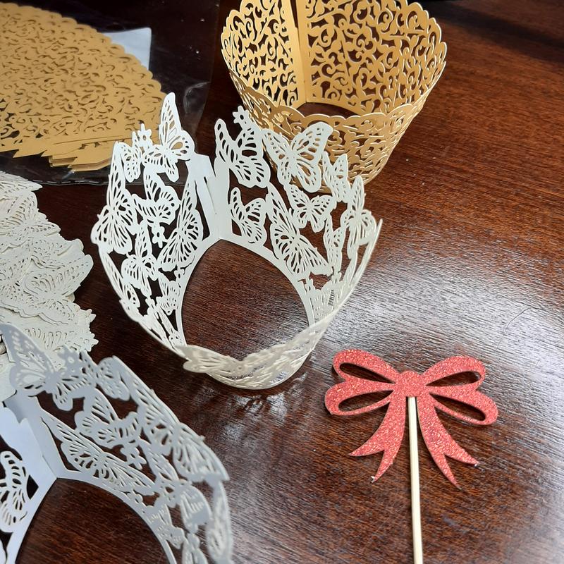 Яркие праздничные рапперы и бумажные корзины для капкейков. Корзины 20 шт (2 набора), блестящие Бантики 12 шт в комплекте. Новые. цена за весь комплект.
