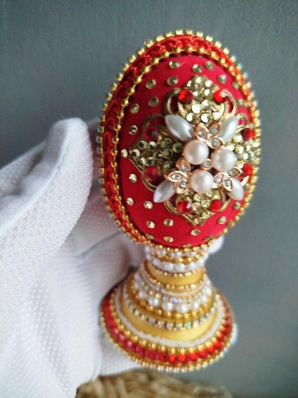 Червоне Великодне інтерьерне яйце ручної роботи виготовлене в единому екземплярі. Яйце обтягнуто тканиною і оздоблене стразами, намистинами, перлами. Унікальний подарунок ручної роботи для друзів, колег, близьких на Великодні свята.Розмір 11*6 см.