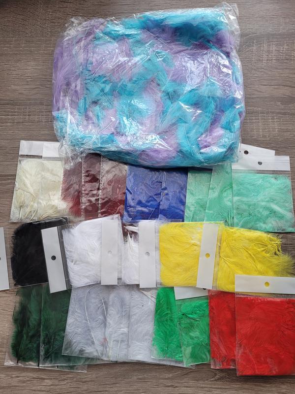Пір'я, в пакетиках маленькі різного розміру. Блакитні і бухкдві великі. За все 250 грн