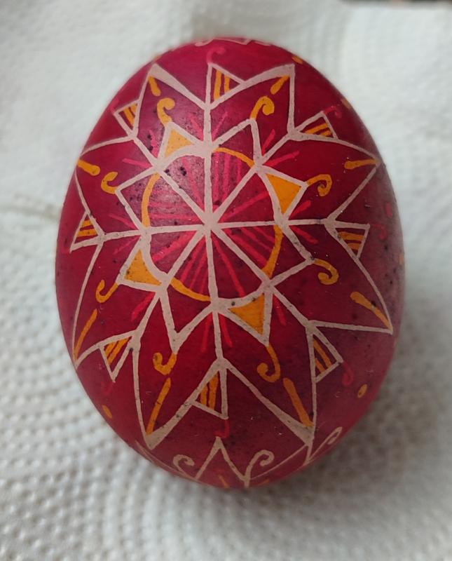 Писанка виконана у традиційному восковому розписі, фарбована у анілінові барвники.