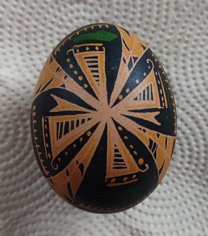 Писанка виконана у традиційному восковому розписі, фарбована у анілінові барвники.