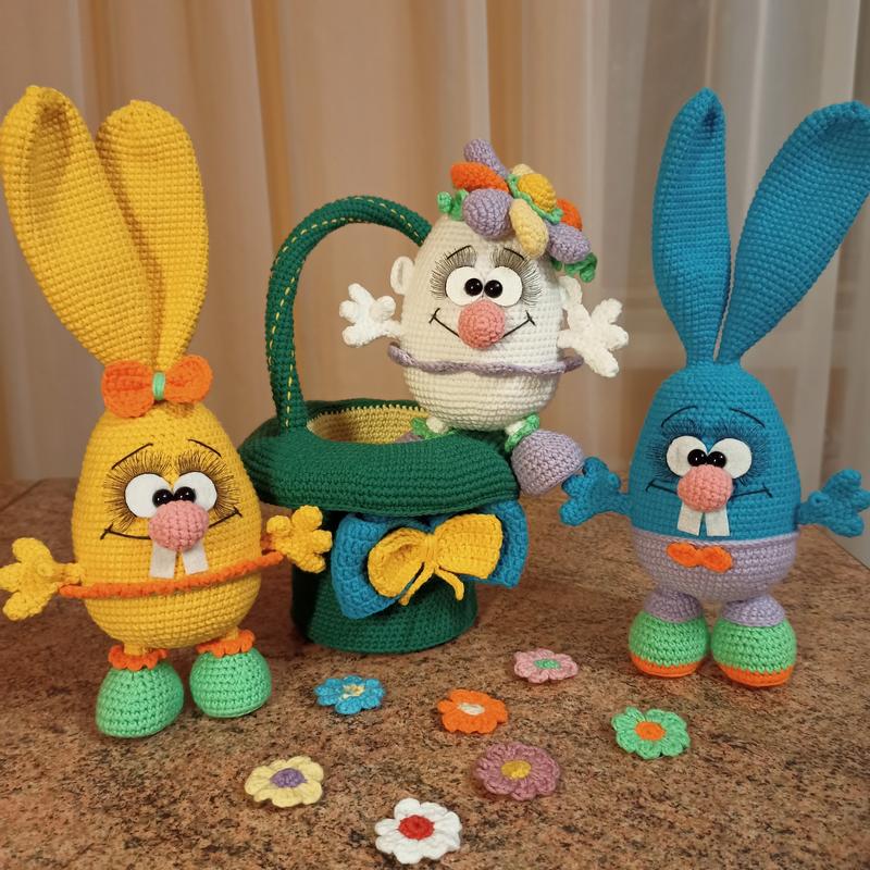Яскравий Великодній набір ручної роботи стане чудовим подарунком та декором до свята! Гіпоалергенна напівбавовняна пряжа, очі на безпечному кріпленні, наповнювач - холофайбер. Висота зайчиків з вушками 26 см Діаметр кошика 10 см