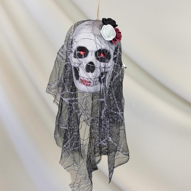 Декор підвісний череп Діва в монтильї 13809 (чорний з білим) - прикраса на Хеллоуїн із серії підвісного декору з петелькою для підвішування на вечірку в стилі Santa Muerte або Хеллоуїн. Череп готичний з фатою виготовлений з якісного матеріалу, який не розсипається, пінополістиролу, фата - гіпюр. Особливого шарму готичному черепу надають три трояндочки з фоамірану. А червоні кристали в очах ефектно переливаються і створюють враження очей, що горять при попаданні світла. Ідеально підходить для прикраси арт-простір клубу, фото зони на Хеллоуїн. Просто повісьте на двері чи стіну, щоби здивувати ваших гостей під час свята Дня всіх мертвих. Також декор можна поставити на край столу, барної стійки та фата буде гарно звисати. Рекомендуємо до цього підвісного черепа готичного ще павутиння, яка допоможе Вам відтворити містичну атмосферу.