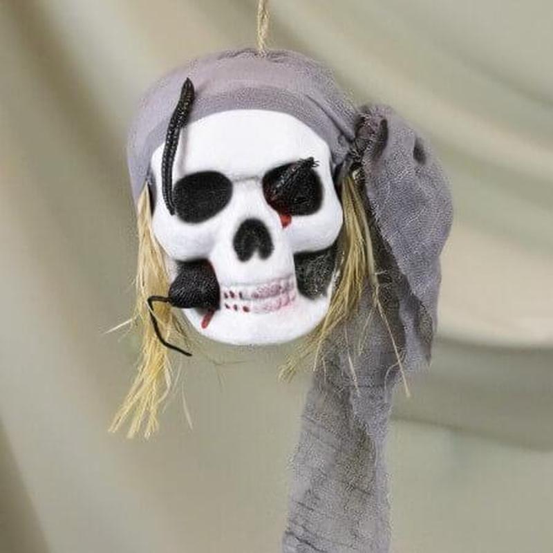 Декор подвесной череп Пират 13803 (серый) 7031 2 8/ HL1-3803 Ширина, см:10 Высота, см:15 Длинна, см:25 Цвет:серый Материал:пенополистирол, марля, шпагат Декор подвесной череп Пират - украшение на Хэллоуин из серии подвесного пиратского декора на Хэллоуин. Череп пирата изготовлен из пенополистирола, бандана - марлевка серого цвета. Особого шарма готическому пиратскому черепу придает проходящая сквозь череп через скулу и глазницу мышь. Идеально подходит для украшения арт-пространства клуба, фото зоны на Хэллоуин или пиратскую вечеринку. Просто повесьте на дверь или стену, чтобы удивить ваших гостей во время праздника Дня всех мертвых.