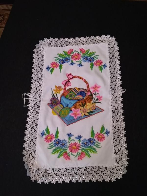 Рушник вишита чеським бісером на габардині.Прикрашена мереживом.Є стрічки для кріплення на кошик.Розмір 67*42
