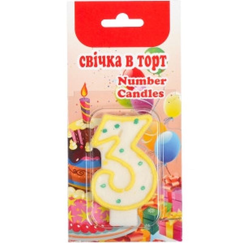 Свічками можна прикрасити торт, тістечка, капкейки. Свічка-цифра кольорова з глітером «3». Висота 7 см