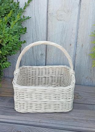 Кошик ручної роботи, виготовлений в техніці плетіння з паперової лози . Міцний, легкий, не боїться вологи. При роботі використовувалися лише екобезпечні матеріали. Колір кошика - ніжно-молочний з перламутром. Можливе виготовлення в іншому кольорі та розмірі. Розмір 24х18см, висота без ручки - 11,5 см, з ручкою - 27см.