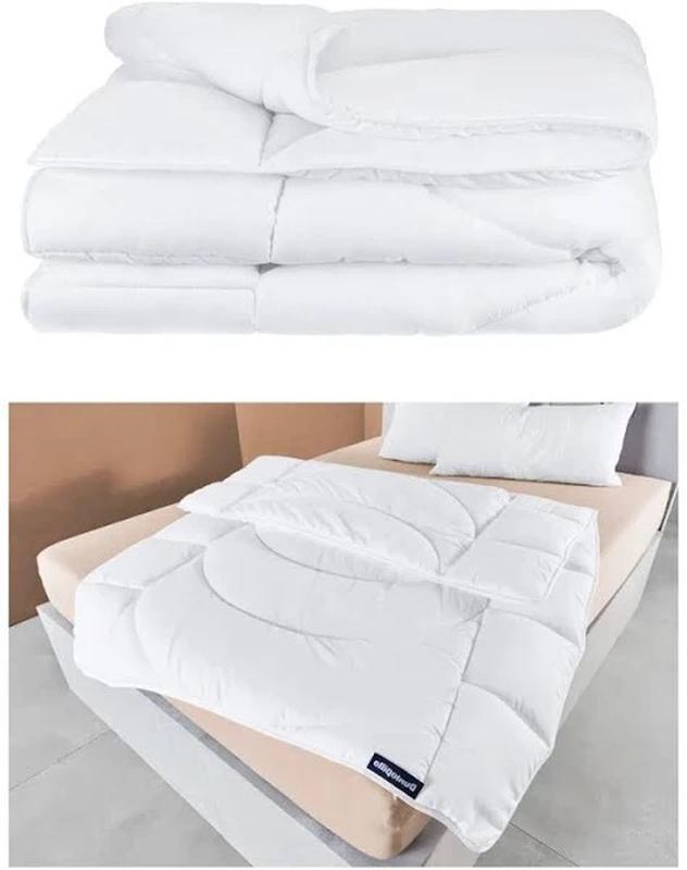 Всесезонна ковдра Dunlopillo. Ідеально прилягає до тіла завдяки стьобанню зони тіла. Можна прати при температурі до 60 °C і сушити в машині. Матеріал: 100% поліестер. Розмір: Ш155 х Д220см.