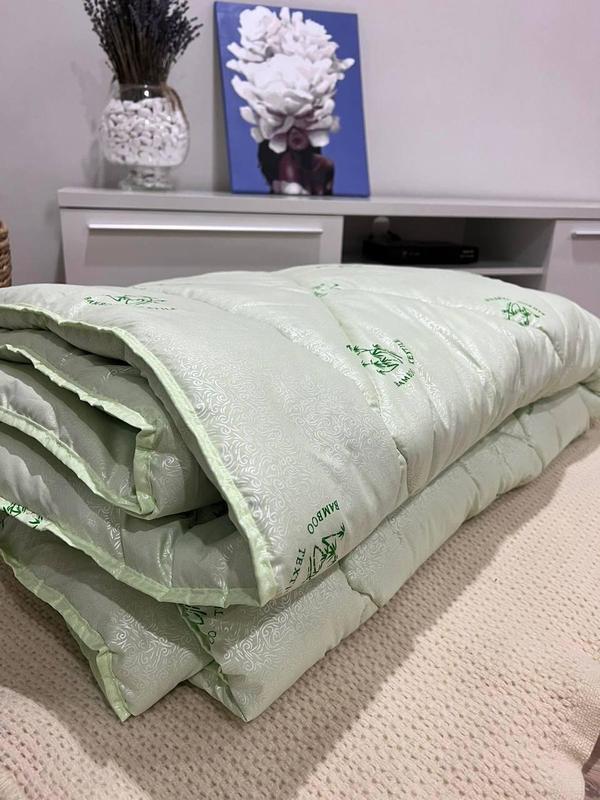 Тепла зимова ковдра, з приємною на дотик тканиною. Мікрофібра не викликає алергію і подразнень, не псується після прання. Наповнювач: Штучне бамбукове волокно Тканина: Мікрофібра Колір: зелений. Щільність: 400 г/м2 (зимовий варіант)