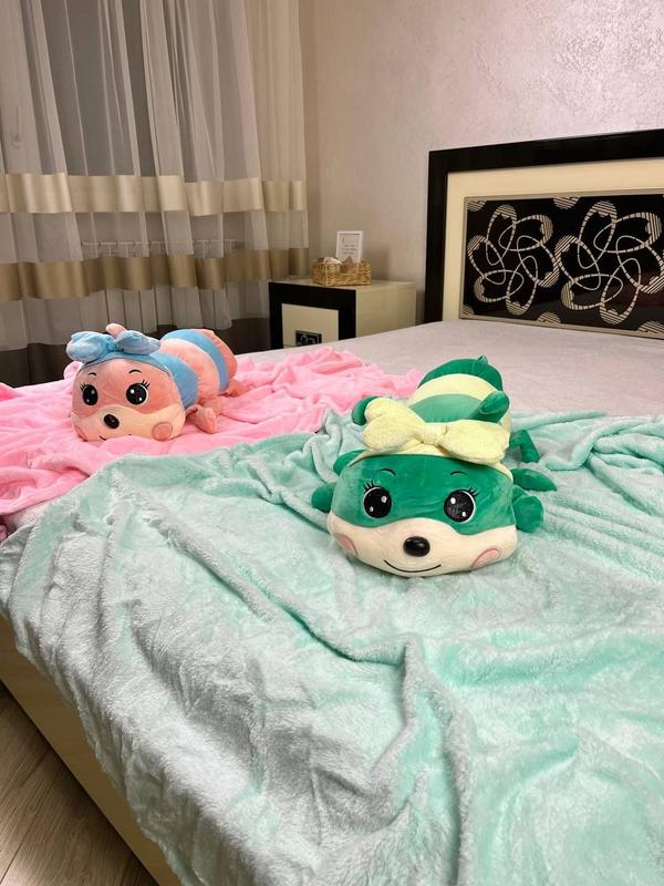 пост.біл.9.11 Іграшка-плед Гусениця 📍3в1: іграшка, плед, подушка 📍Розмір пледу: 165✖️100 📍Матеріал: плюш 📌Кольори рожевий та зелений
