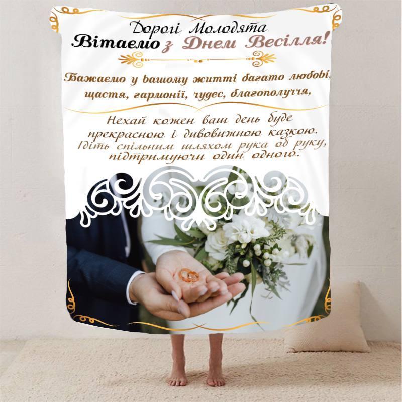 Плед 3D з побажаннями для молодят на весілля Плед 3D з побажаннями для молодят на весілля з яскравою печаткою стане чудовим подарунком близькій людині, порадує погляд і зігріє прохолодними вечорами. Теплий, м'який і дуже приємний на дотик, яскравий плед з індивідуальним зображенням зігріє не тільки тіло, а й душу. Ви можете змінити текст побажань та фото на свої. Макет буде узгоджений з Вами перед відправкою. Можливості: - Вибрати дизайн - Додати фотографії - Написати власне побажання - Вибрати колір пледу - Вибрати розмір Персоналізоване виготовлення пледа зі своїм макетом можливе лише за 100% передоплатою. Характеристики: - Тип: плед - Матеріал: плюш - Склад тканини: 30% поліефір, 40% акрил, 30% поліестер - Використання: для спальні, вітальні, дитячої, пікніка, авто - Колір: різні кольори - Країна виробника: Україна ##