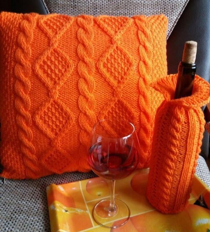 Подарунок на різдво - в'язана подушка мандаринового кольору та чохол для пляшки