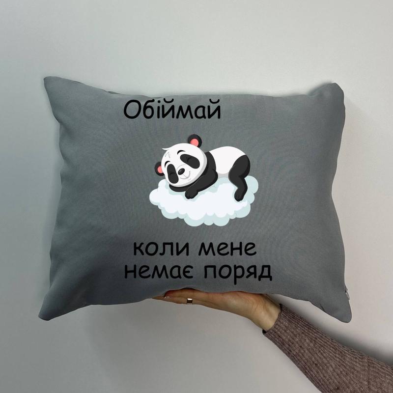 Подушка з принтом габардинова обіймай коли мене немає поряд (панда), сіра 35х45 (1504)