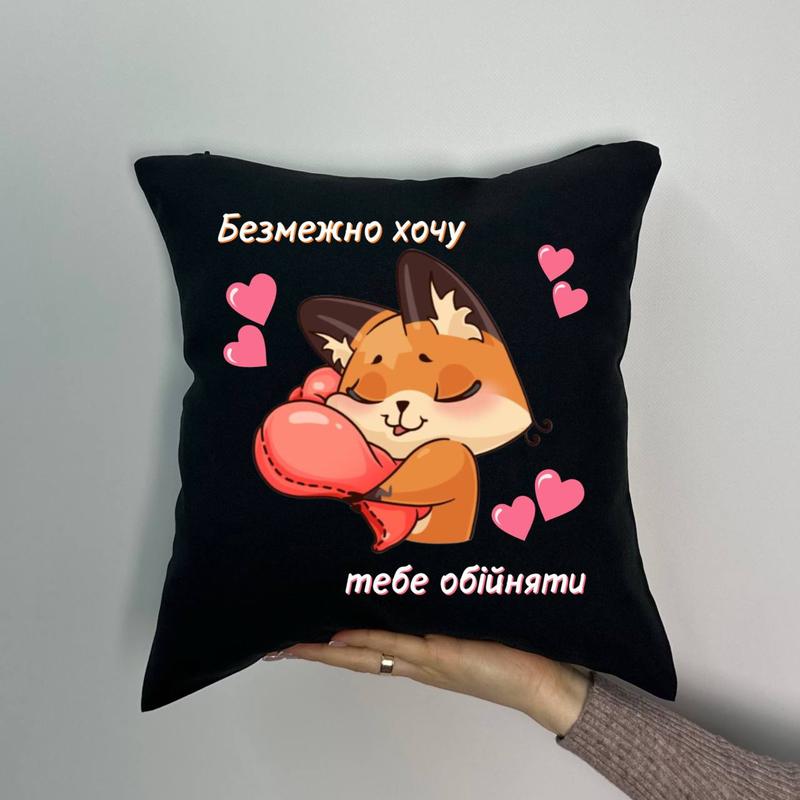 Подушка з принтом габардинова безмежно хочу тебе обійняти, чорна 35х35 (1550)