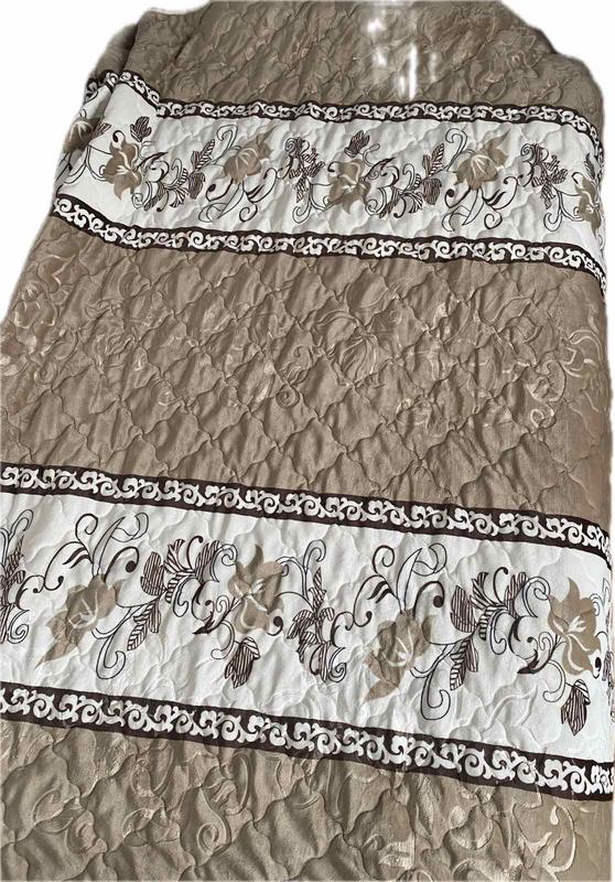Це покривало має стьобану текстуру, яка створює об'ємний малюнок. Основний колір — бежевий, на якому є ледь помітні візерунки. Покривало декороване двома горизонтальними смугами білого кольору, на яких розташовані складні коричневі та бежеві візерунки у вигляді квітів, листя та завитків. Краї цих смуг обрамлені широкою декоративною смужкою з коричневим абстрактним орнаментом. Особливості: * Дизайн: Сучасний, з елементами класичного орнаменту. * Колірна гама: Бежевий, коричневий, білий. * Текстура: Стьобана. * Розмір: 200х220 см. Покривало упаковано в прозору сумку на блискавці, що забезпечує зручне зберігання та транспортування.