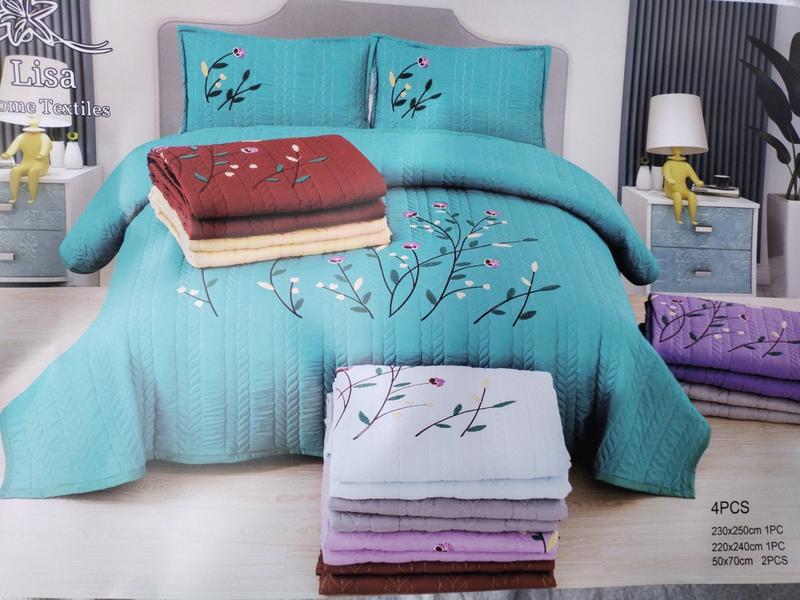 : Комплекти "ВИШИВКА" 🏷️Розмір : покривало 230*250 см стьогане + простирадло 200*240 см + дві наволочки 50*70 Простирадло однотонне х/б в колір до кольору покривала, наволочки стьобані як покривало (на змійці) Кольорів 9: світло-сірий, темно-сірий, фіолетовий, бордовий, коричневий, рожевий, бірюзовий, лаванда, персик
