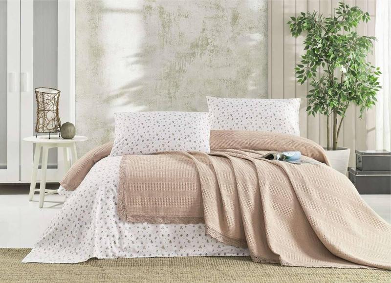 Комплект хлопкового постельного белья ранфорс с летним вафельным покрывалом-пледом евро ра...
