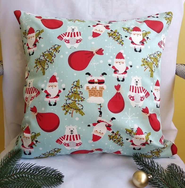 Новорічна Наволочка з Сантою на блакитно бірюзовому тлі з бавовни для декора інтер'єра або можна спати на цих наволочках, бо вони з натуральної бавовни Розмір 40*40 см Тканина 100% бавовна, в наявності є дві наволочки Наволочка на потаємній блискавці доставка укрпоштою або новою поштою