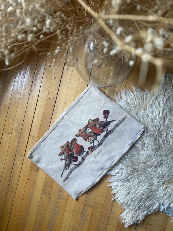 Стильна декоративна наволочка з лляної тканини, прикрашена яскравою вишивкою трьох червоних пташок у сомбреро. Веселий сюжет із музичними інструментами та надписом “CARAMBA!” додає виробу характеру та настрою. Щільна тканина, акуратні шви, нейтральний бежевий фон — чудово пасує до будь-якого інтер’єру. Бокова блискавка трошки розійшлась по швам.