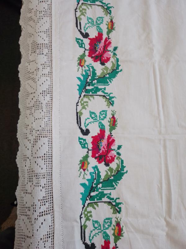 Підзорник вишитий хрестиком на білосніжному поточні.Без плям але є пошкодження,їх видно на фото. Розмір 187*70см.На повну довжину кружева не вистачає(недоліки на фото).