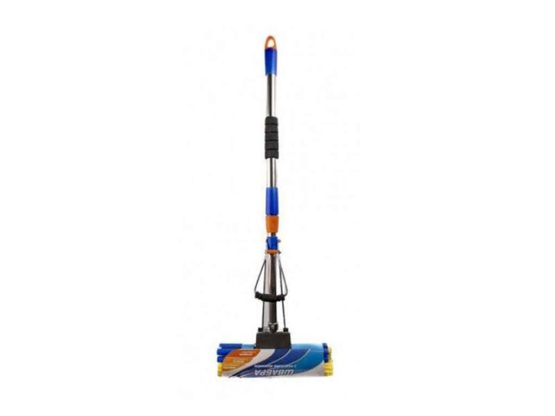 Швабра з подвійним посиленим віджиманням, пластиковою основою, гнутою телескопічною ручкою з нержавіючої сталі та додатковими антиковзними тримачами на ручці віджиму та рукоятці Склад: Нержавіюча сталь , Поліпропілен, ПВХ. . Ширина Губки - 27см. Довжина виробу – 86-116 см..