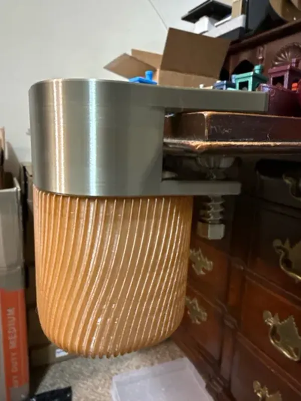 Настільний кошик із затискачем Це сміттєвий кошик, що фіксується на столі, який допоможе вам підтримувати чистоту і порядок на робочому місці. Він надійно кріпиться до краю столу за допомогою двох гвинтових затискачів, що робить його ідеальним для збирання невеликих обрізків, шматочків нитки або паперу, які зазвичай виявляються на підлозі. Сам контейнер кріпиться до затискача за допомогою фрикційного поворотного механізму, що дозволяє легко знімати, випорожняти або міняти його. Інструменти не потрібні, просто поверніть та потягніть. Затискач доступний у двох розмірах: 35 мм та 55 мм. Він підходить для більшості стандартних поверхонь столів. Роздрукуйте той, який найкраще підійде до вашого столу! Якщо ваш стіл товстіший, залиште коментар, і я із задоволенням збільшу розмір або надам альтернативну версію. Висота самого контейнера становить 95 мм, що забезпечує пристойний об'єм для звичайних відходів зі столу – ідеально підходить для таких речей, як допоміжні матеріали, обрізки паперу та інші дрібні обрізки. Висота затиску /кришки становить 55 мм, що надає вузлу компактного вигляду, але при цьому він міцний і надійний. Загальна висота повного складання складає приблизно 150 мм, що дозволяє легко розмістити її в кутку столу, не загороджуючи робочий простір. Золотий, зелений, білий, оливковий, синій, червоний, білий в крапочку, беж, сірий, чорний, рожевий, сірий, глина, эсть також білий , чорний, сірий матові ! Якщо цікавлять інщі кольори запитуйте. *****************************************************************