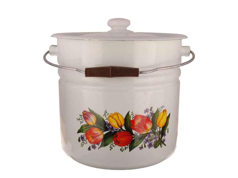 Емальоване відро використовується для зберігання та перенесення продуктів, рідин тощо. У відрі вода швидко нагрівається і залишається теплою тривалий час. Тип джерела тепла: підходить для кухонних плит: газові, електричні Відро на 12,0 л з кришкою / 27 х 26 см Форма: циліндрична Матеріал: сталь з емальованим покриттям Ручка - зручна і практична Товщина стінок 1,2 мм Дно: покриття емаллю, з підвищеною термовіддачою Виробник: ТМ IDILIA Країна виробництва: Україна Деколь: в асортименті