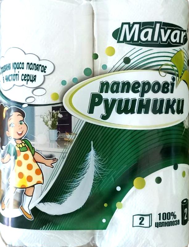 Рушники паперові целюльозні білі двошарові в двох рулонах на гільзі, торгової марки "Мальвар". Рушники фасовані по 2 рулони в упаковці. 100% целюлоза.