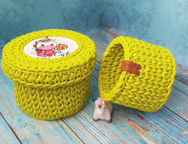 Яркий красочный домашний декор для детской комнаты. Отличная идея подарка для девочки или мальчика, которые любят единорогов. Круглые салатовые корзины для хранения станут местом для мелких детских вещей - резинок, значков, пуговиц и ключей. Органайзер-корзинка крючком на деревянной основе предназначен для ручек, карандашей и фломастеров. В набор из 2-х вязаных крючком круглых корзинок входит: 1. Корзина единорог с крышкой Размер корзины: высота без крышки 10 см, высота с крышкой 16 см, диаметр крышки 16 см, диаметр корзины 14 см. 2. Корзина маленькая с деревянным дном Размер корзины: высота 3,54 дюйма / 9 см, диаметр 4,3 дюйма/11 см. Корзины связаны из шнура, крышка и дно - деревянные